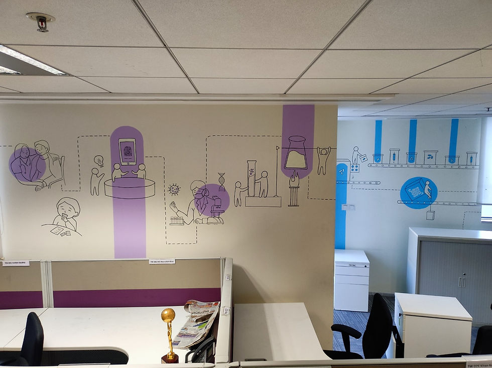 Dr. Reddy's is a recent project that showcases a 50 feet mural designed to depict the journey and purpose of the company. This project was created with the intention of adding energy to the office floor and a fun representation of the company's values.